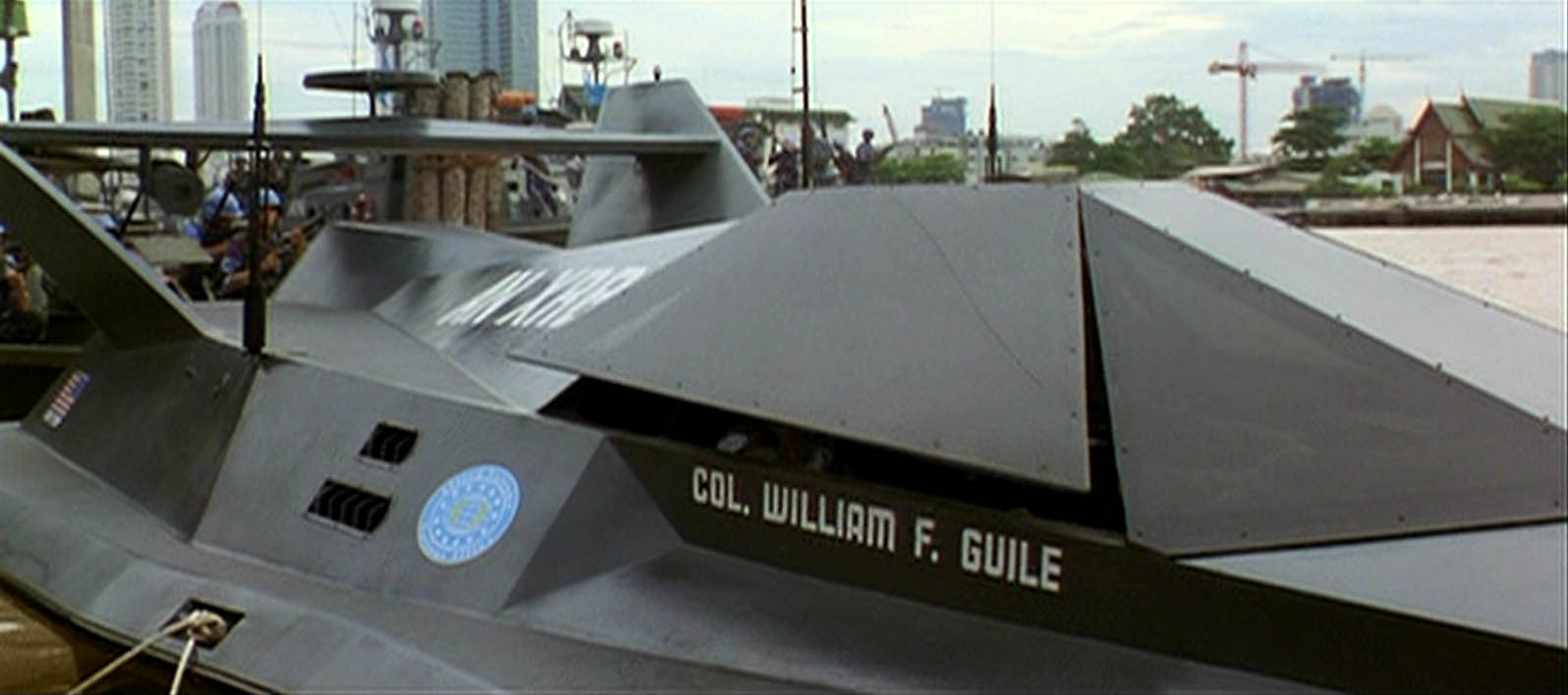 First off, I like that someone tacked on fabric over the windows so that you can just almost see through them. This must be to cut down the glare from the sun. Second, Guile had his name painted on the boat. I'm pretty sure that at no point in history has any military commander ever told someone "hey, paint my name on the vehicle that's going to be transporting me so everybody knows I'm on it." Sure, it's a "stealth boat," but people can still see it if they look at it, right?